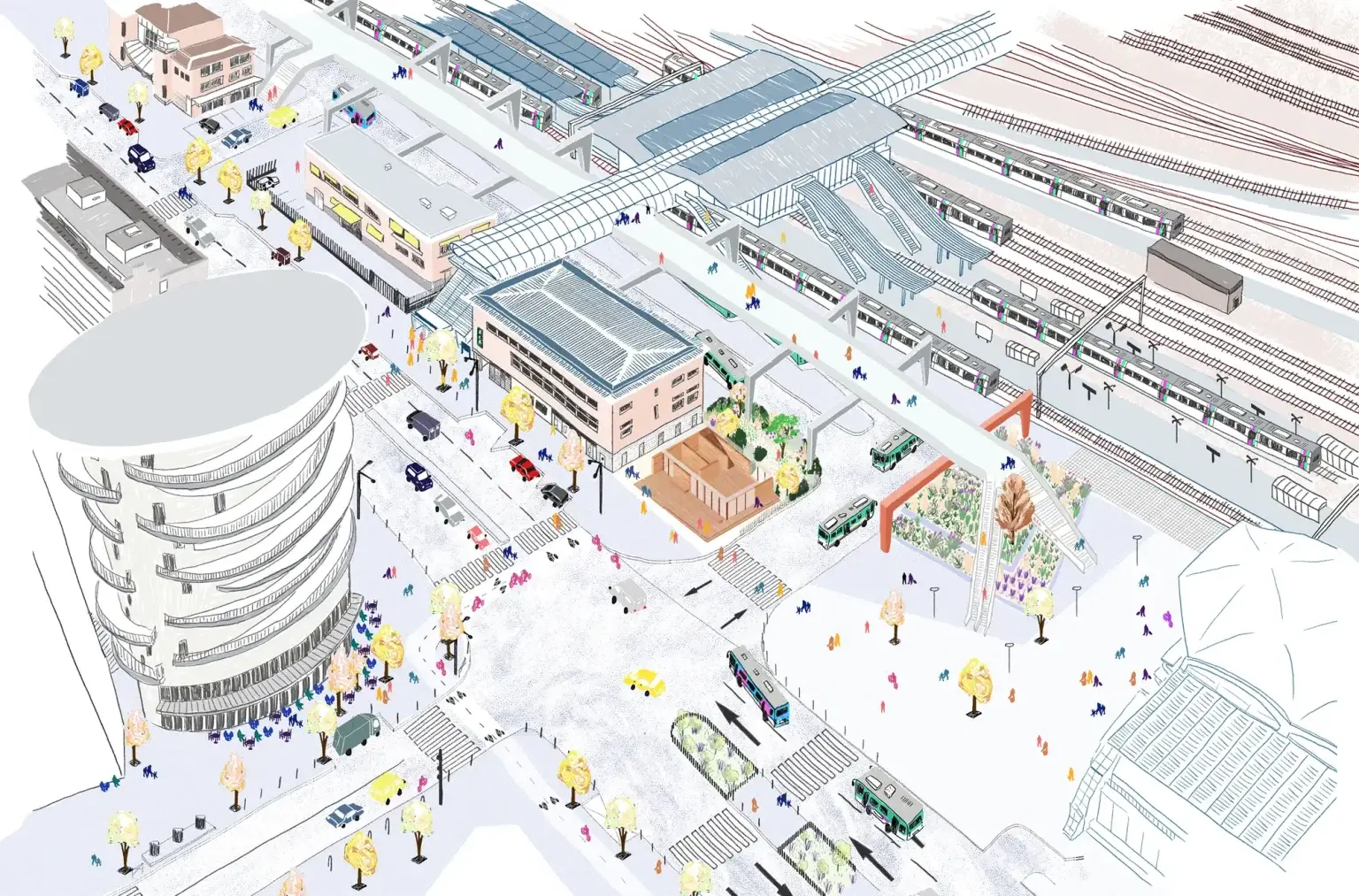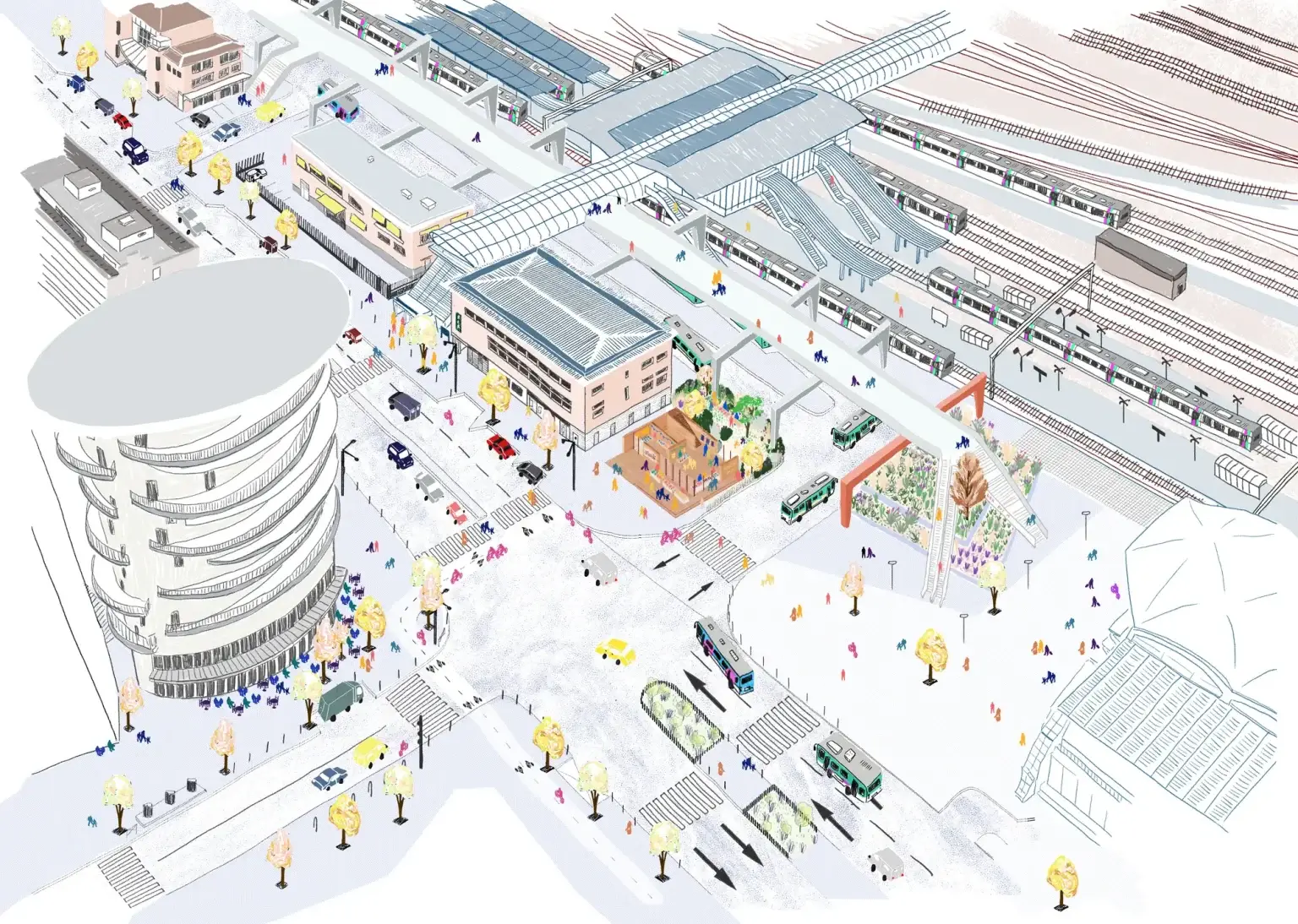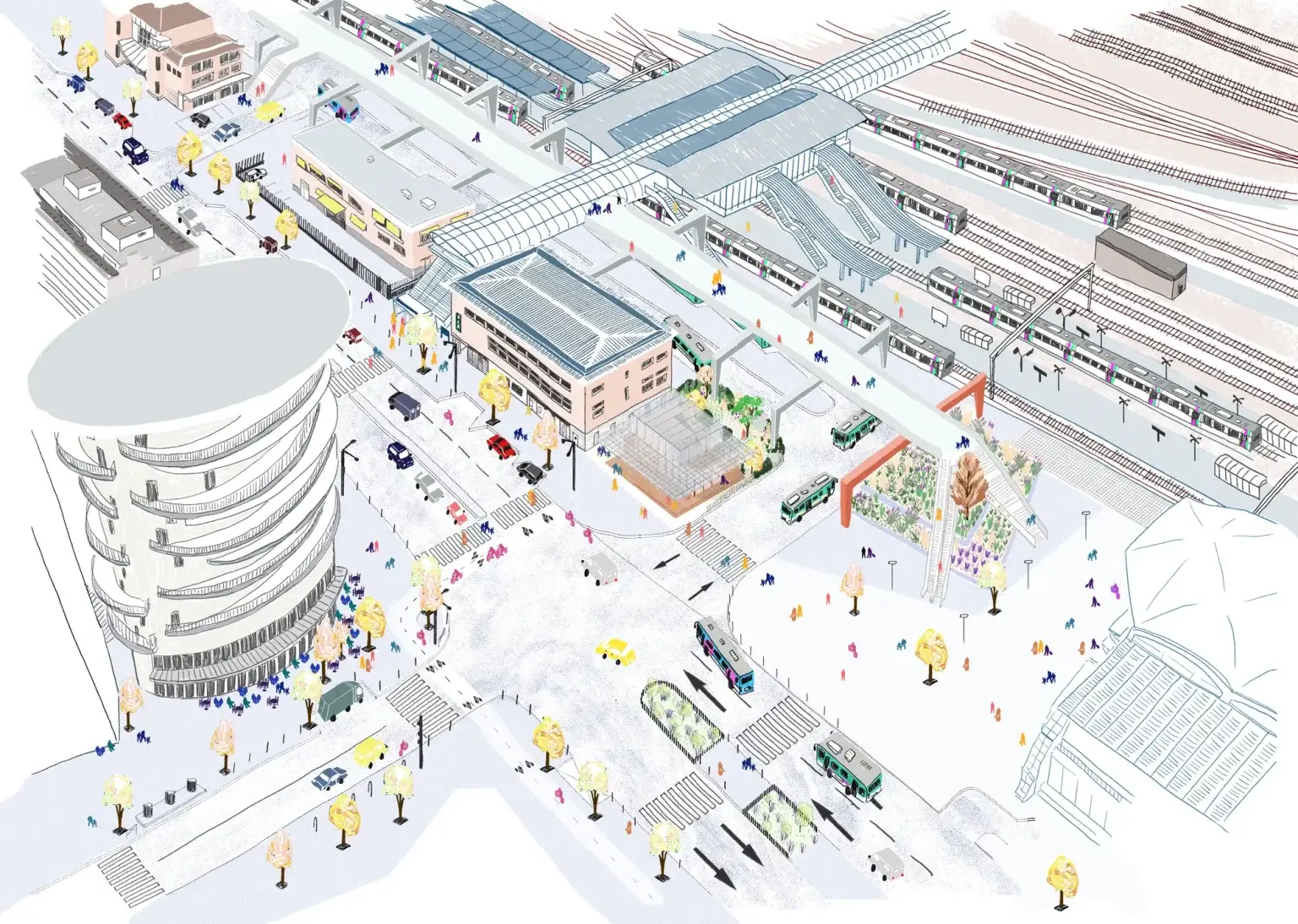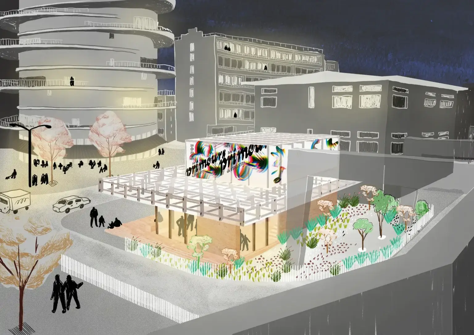 Le projet vise à implanter un équipement commercial sur un site stratégique, le parvis des gares routières, TGV et RER B. L’enjeu est de créer une construction compacte, lisible et accueillante, capable de s’inscrire dans un environnement urbain très fréquenté. Le bâtiment prend place à l’angle de l’avenue Carnot et de la rue Florence Arthaud, sur une parcelle aujourd’hui inoccupée. Sa volumétrie simple et son implantation permettent de renforcer sa singularité tout en préservant les circulations piétonnes et les vues vers les gares.