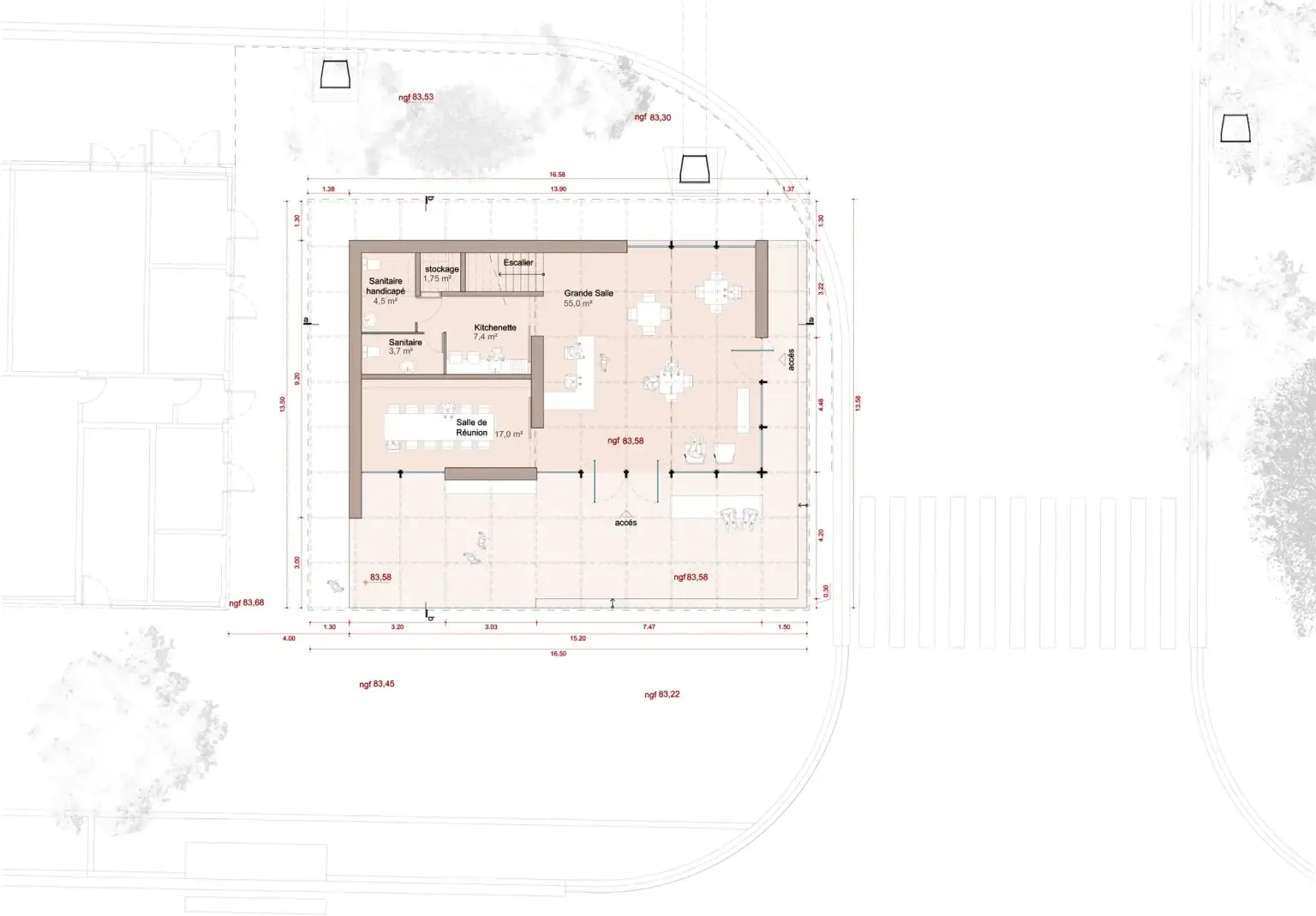 Le rez-de-chaussée est entièrement dédié à l’accueil du public, avec un espace de vente ouvert, visible et facile d’accès. L’étage constitue un lieu de travail confortable pour le personnel, pensé comme un volume lumineux et calme en retrait de l’agitation du parvis.