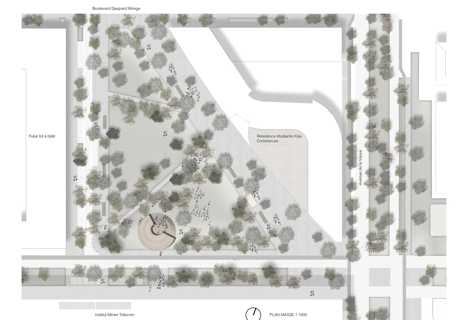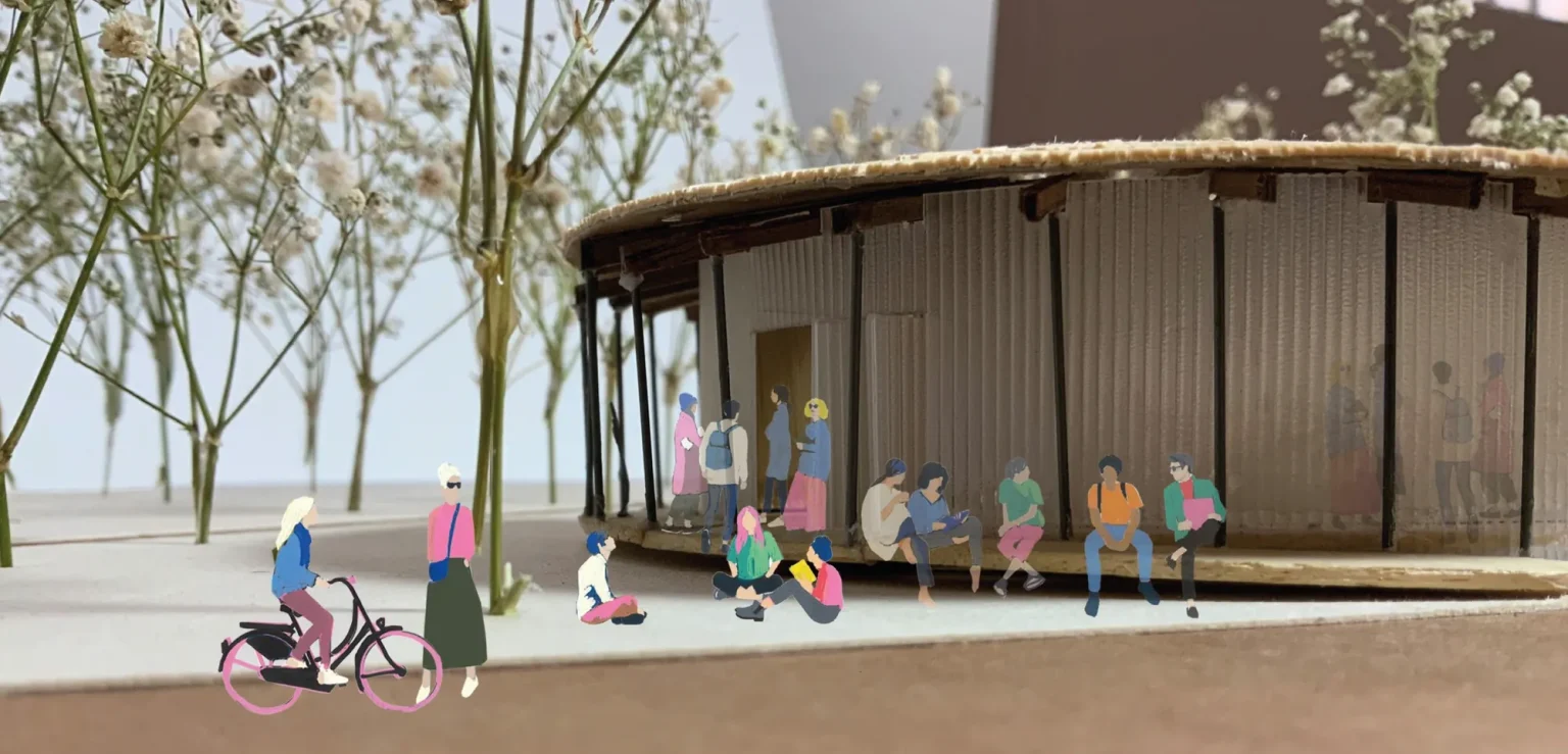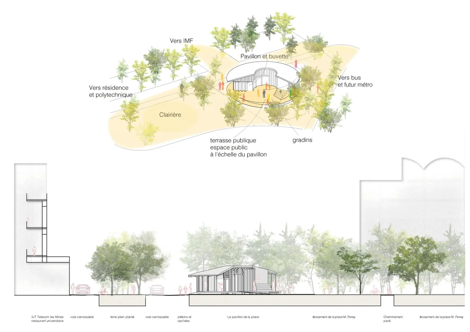 Le pavillon sera également un lieu de transmission : sa fabrication impliquera des étudiants et apprentis dans un « chantier école », mêlant conception, construction et apprentissage. Conçu pour durer quelques années avant d’être démonté et réinstallé ailleurs, il devient ainsi un espace public hybride, vivant, adaptable et écologique, au service de la communauté et du campus de Paris‑Saclay.