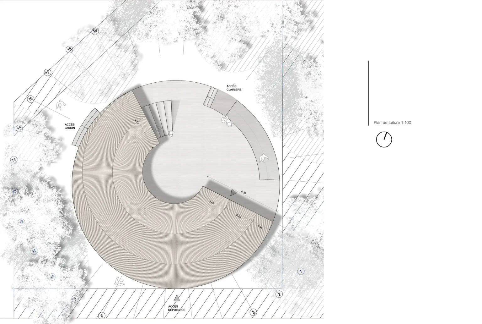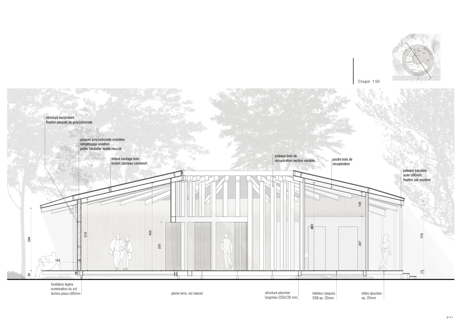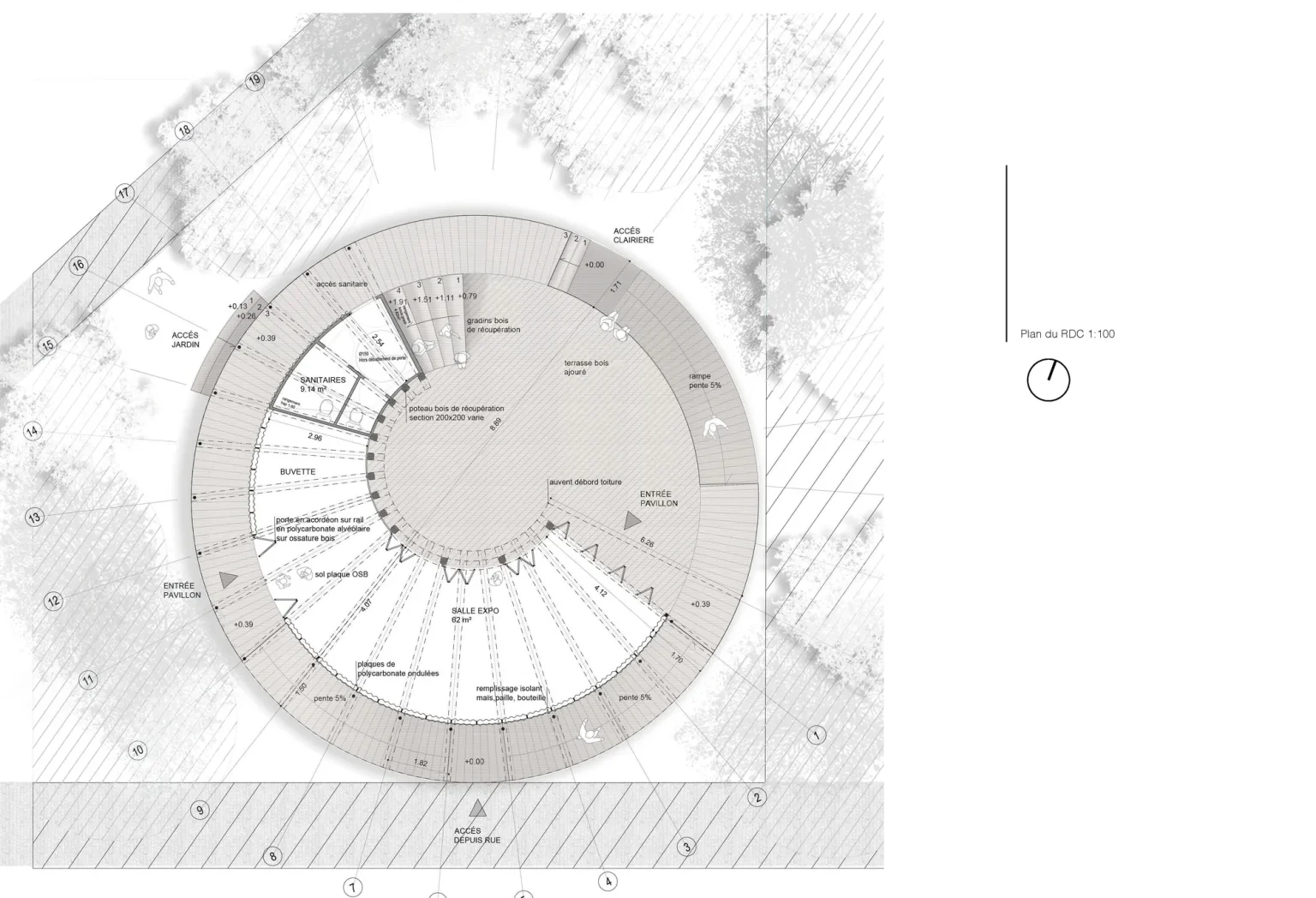 L’architecture du pavillon s’inspire du plateau agricole et de la forêt urbaine environnante. Sa forme circulaire, son toit en bois de réemploi et ses façades filtrantes en polycarbonate créent un signal visuel fort et un espace accueillant, intégrant intérieur et extérieur de manière fluide.