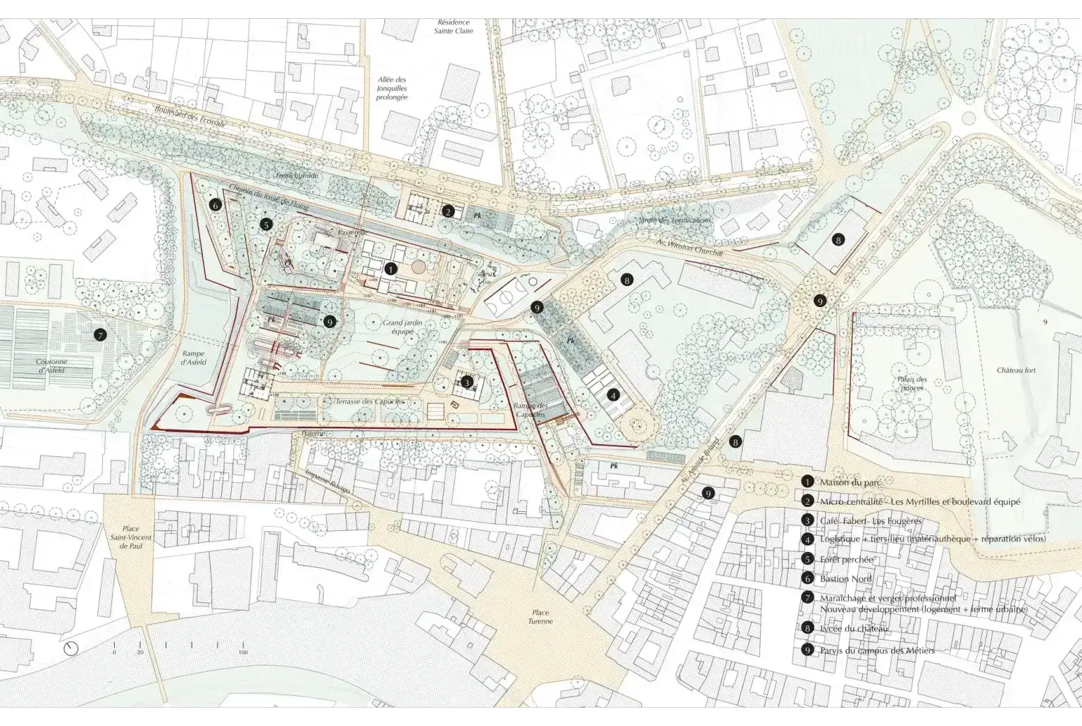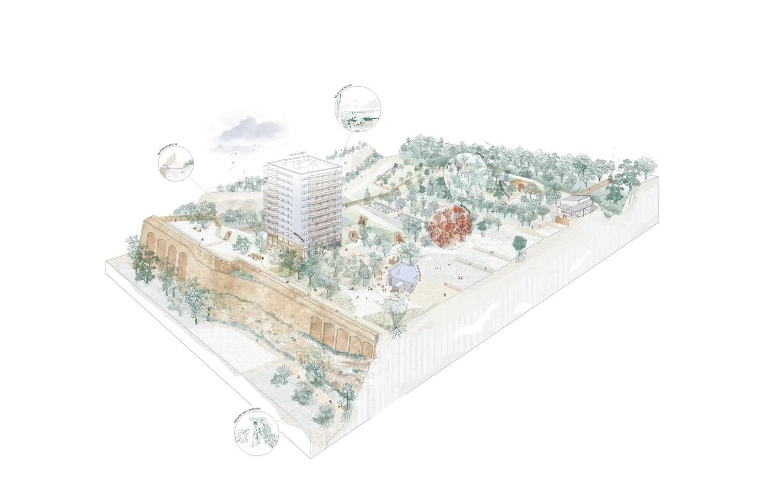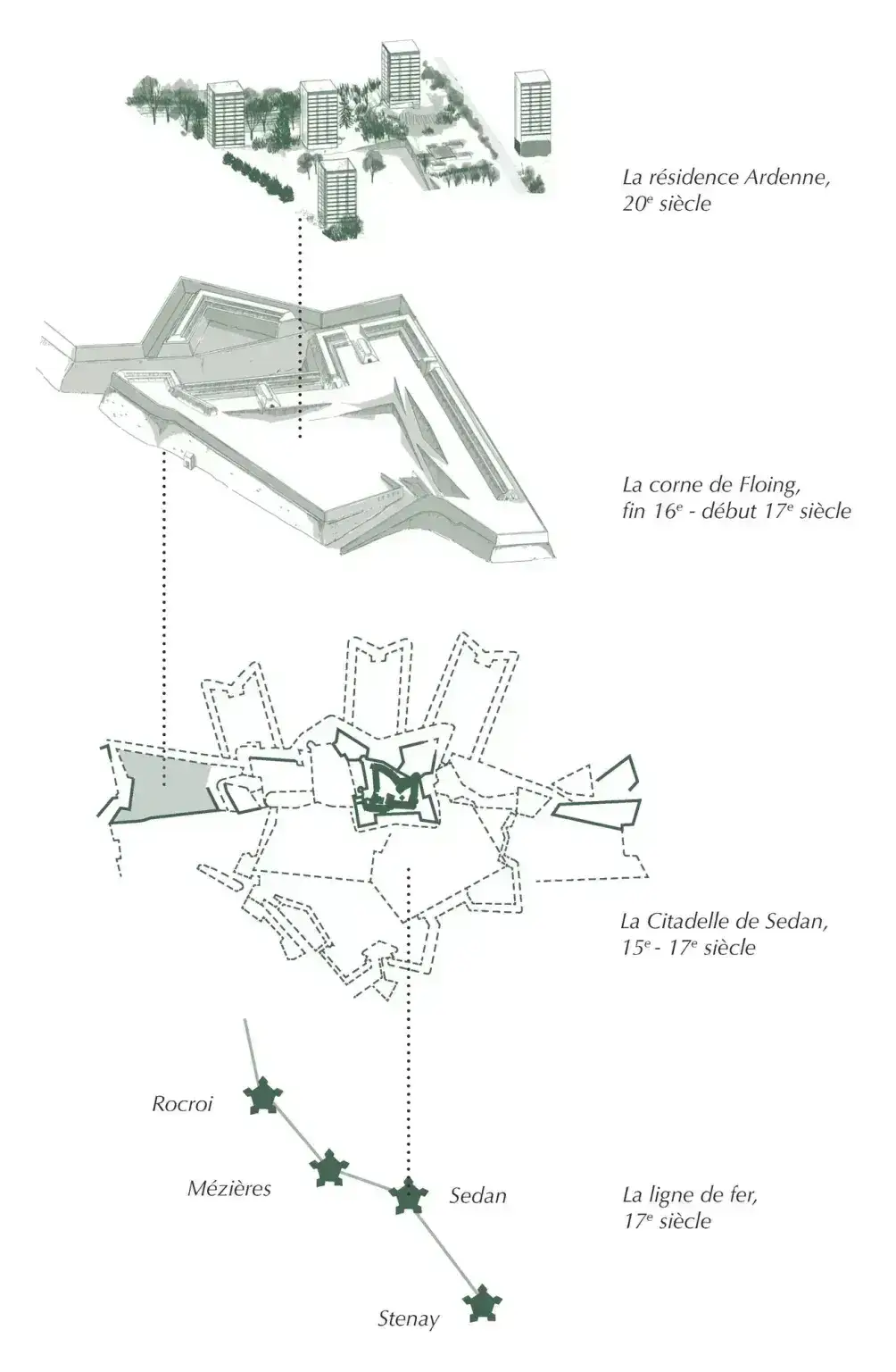 Le projet se situe sur l'ancienne Corne de Floing, vestige majeur des fortifications de Sedan, pour faire de la résidence Ardenne un pivot entre patrimoine, grand paysage et usages contemporains. L’enjeu est de régénérer l’ensemble en révélant la structure défensive originelle, en réactivant les dispositifs militaires comme supports d’usages quotidiens, et en redonnant une lisibilité territoriale au parc de la Citadelle. Le grand jardin devient un espace-refuge climatique et écologique, un lieu d’expérimentation fondé sur les milieux naturels et les vestiges bâtis, tandis que les tours rénovées, habillées de matériaux locaux et de réemploi, réaffirment une relation sobre au paysage.
