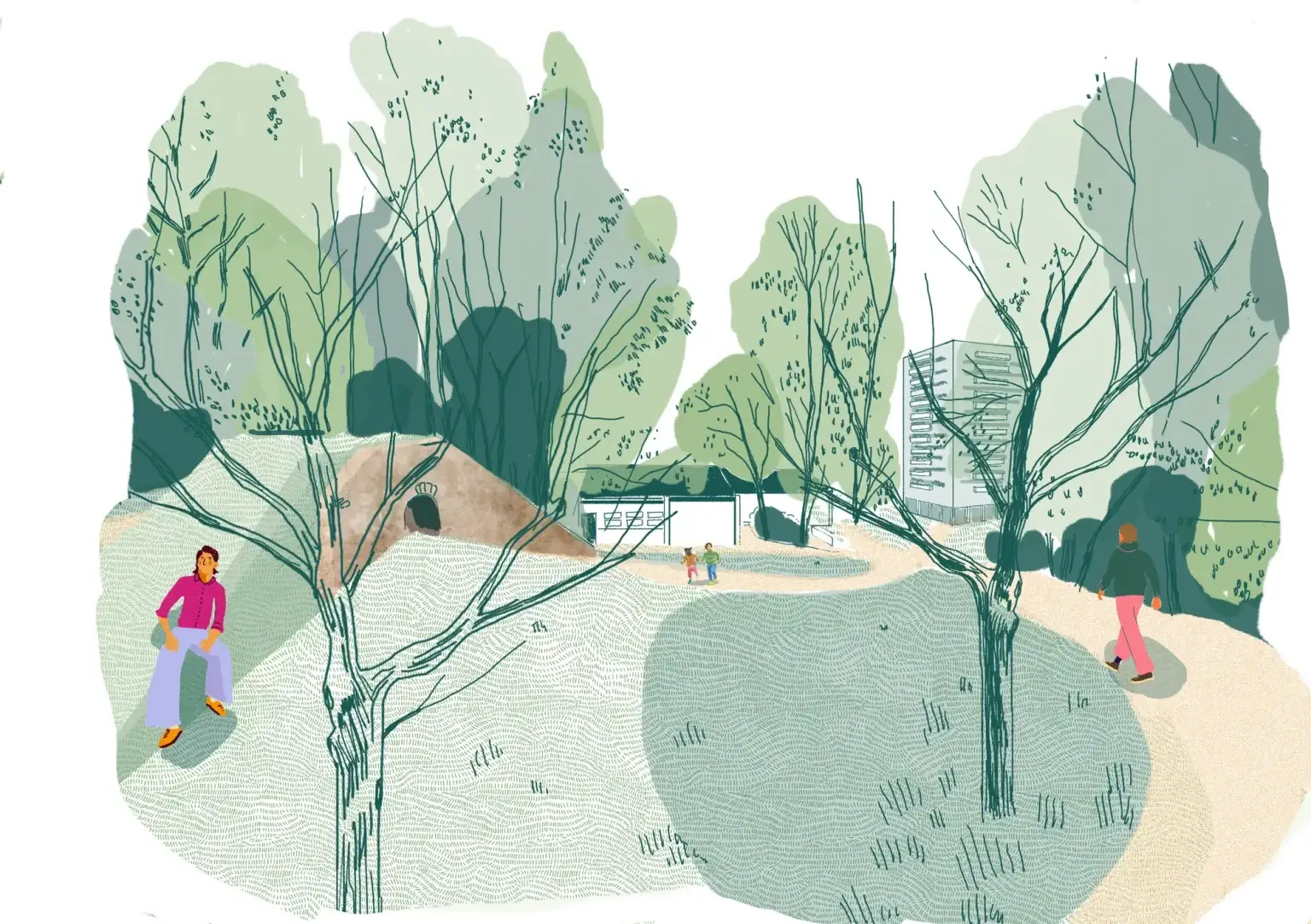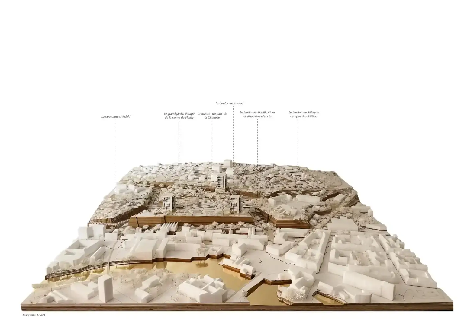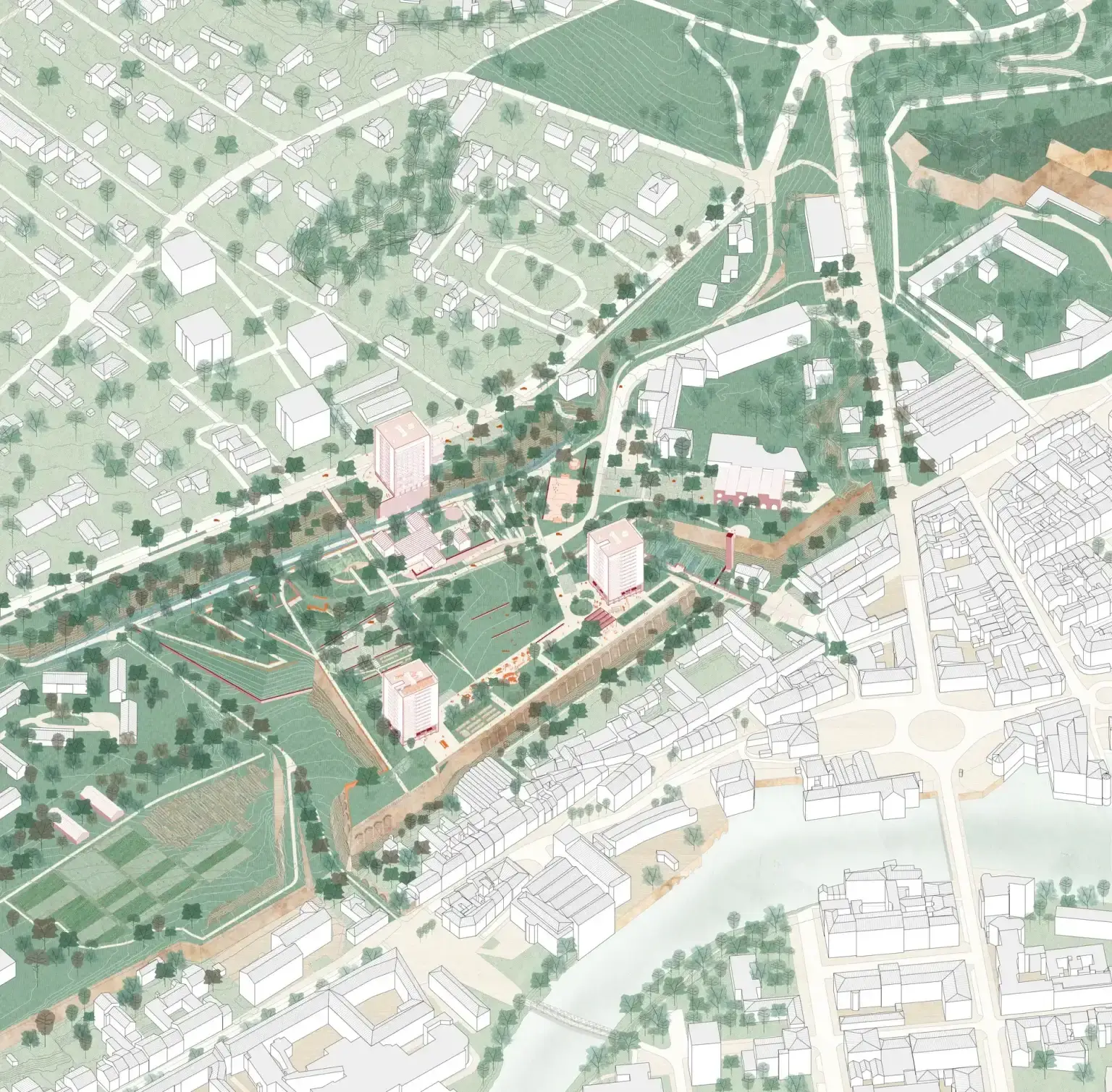 Le projet se situe sur l'ancienne Corne de Floing, vestige majeur des fortifications de Sedan, pour faire de la résidence Ardenne un pivot entre patrimoine, grand paysage et usages contemporains. L’enjeu est de régénérer l’ensemble en révélant la structure défensive originelle, en réactivant les dispositifs militaires comme supports d’usages quotidiens, et en redonnant une lisibilité territoriale au parc de la Citadelle. Le grand jardin devient un espace-refuge climatique et écologique, un lieu d’expérimentation fondé sur les milieux naturels et les vestiges bâtis, tandis que les tours rénovées, habillées de matériaux locaux et de réemploi, réaffirment une relation sobre au paysage.